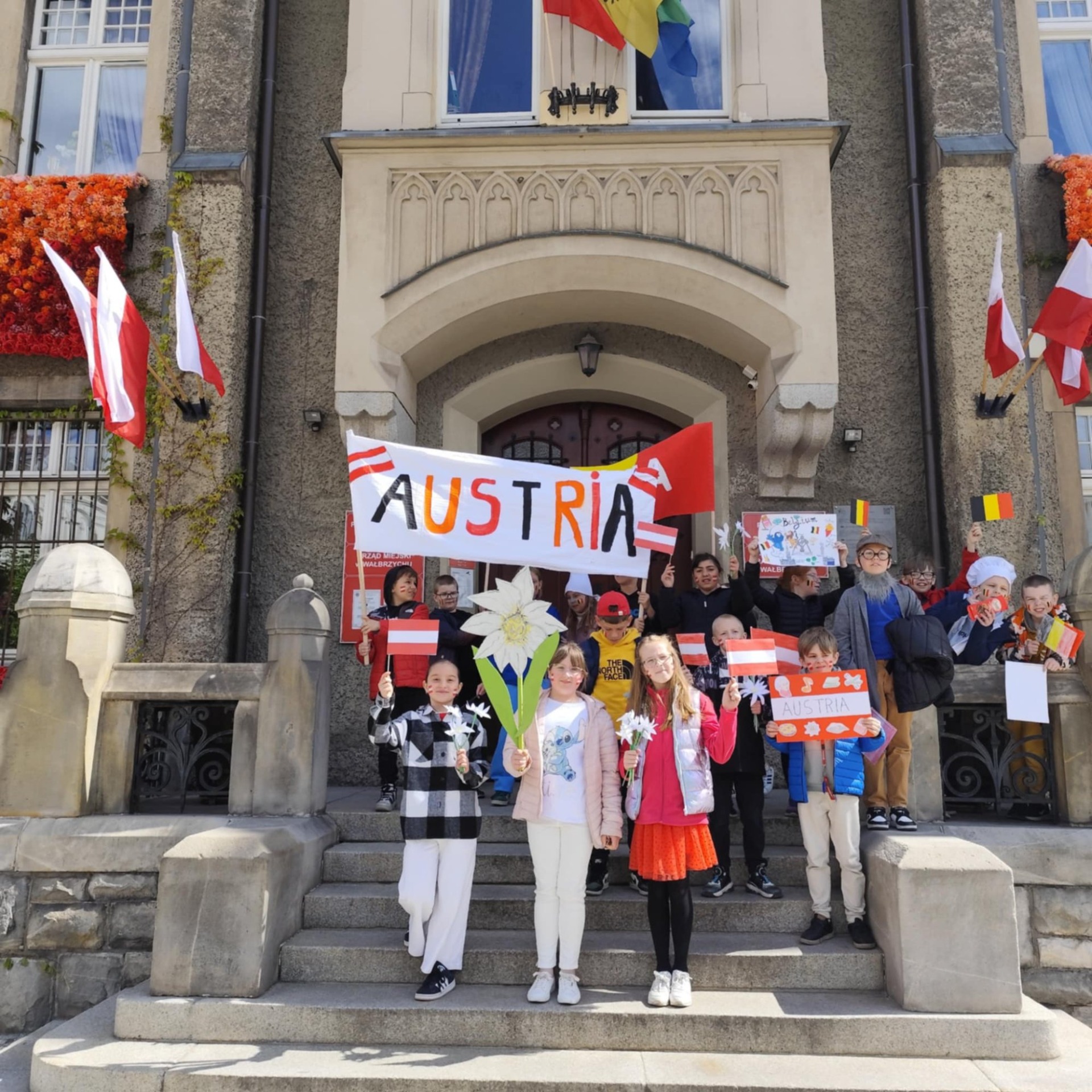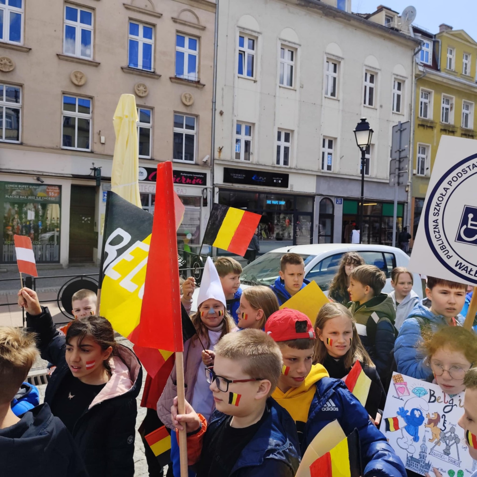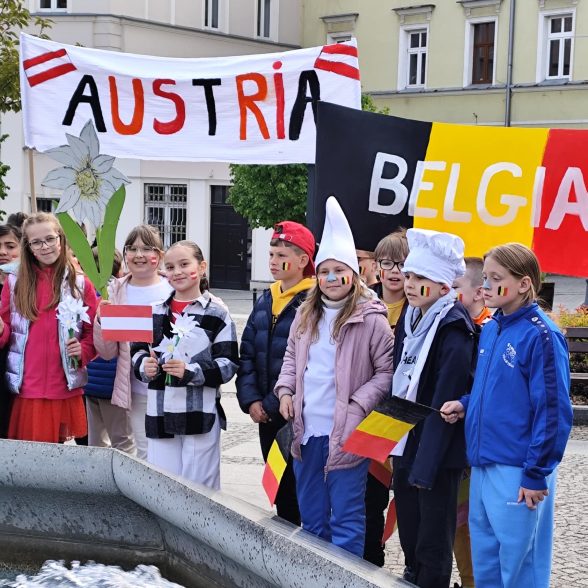 Klasa czwarta wraz z wychowawcą Elżbietą Bibrowską i panią dyrektor Renatą Gibes wzięła aktywny udział w obchodach Dnia Europy. Uczniowie przygotowali kolorowe plakaty z symbolami Austrii i Belgii, flagami krajów, przepiękne banery oraz pomysłowe stroje. Wszyscy uczniowie wzięli udział w uroczystym przemarszu ulicami miasta, niosąc swoje plakaty i flagi.