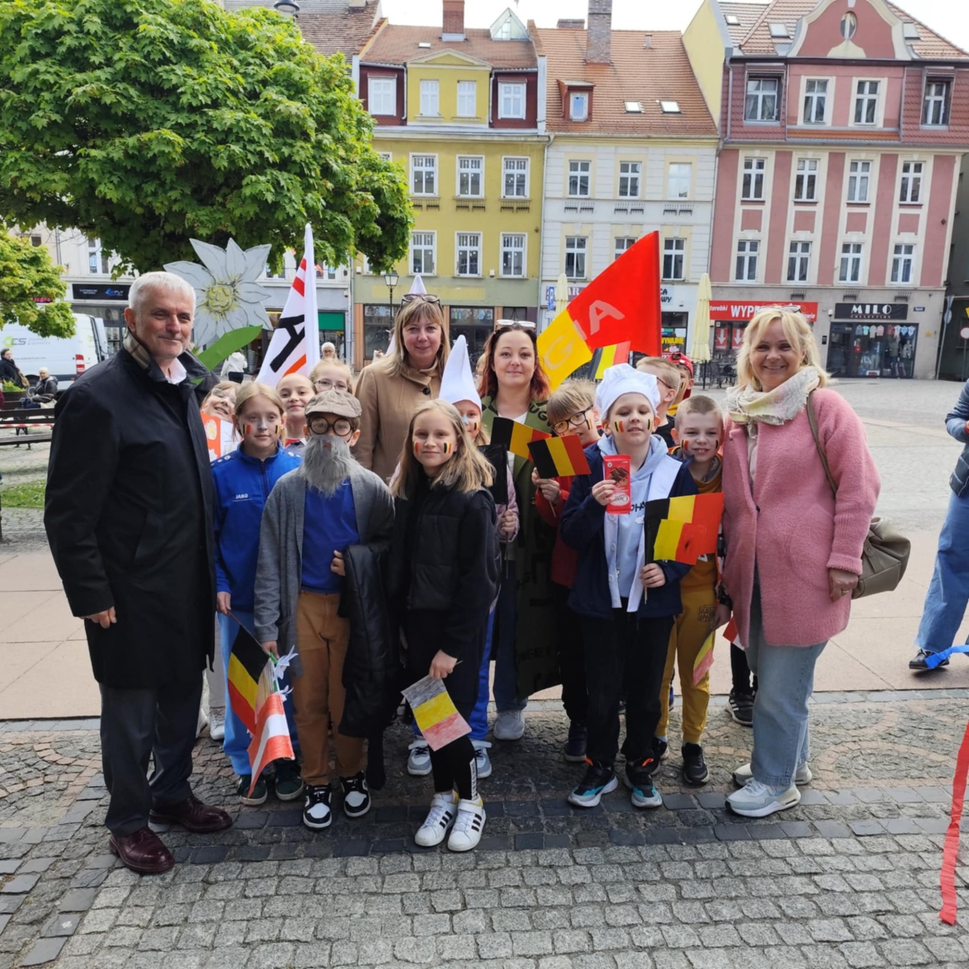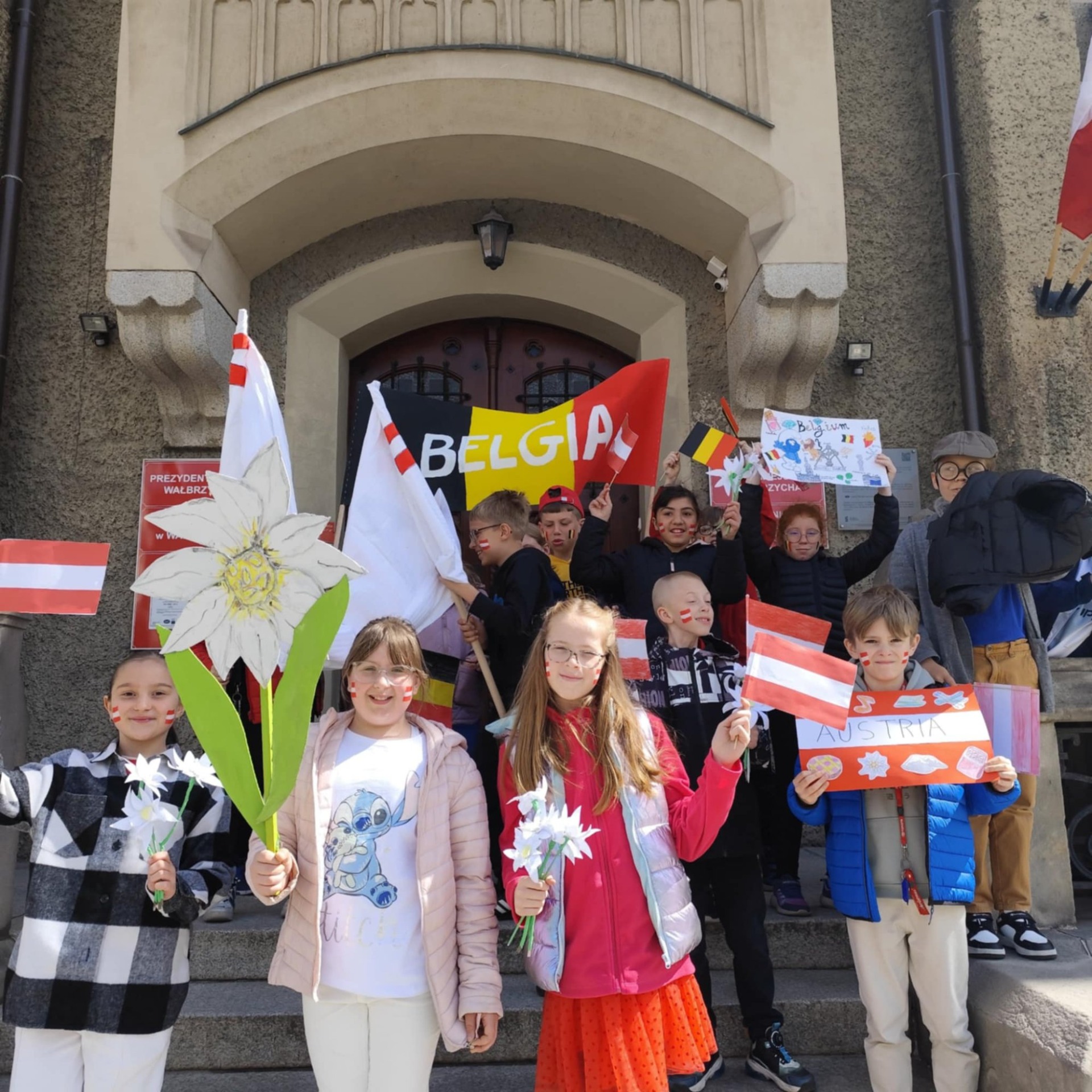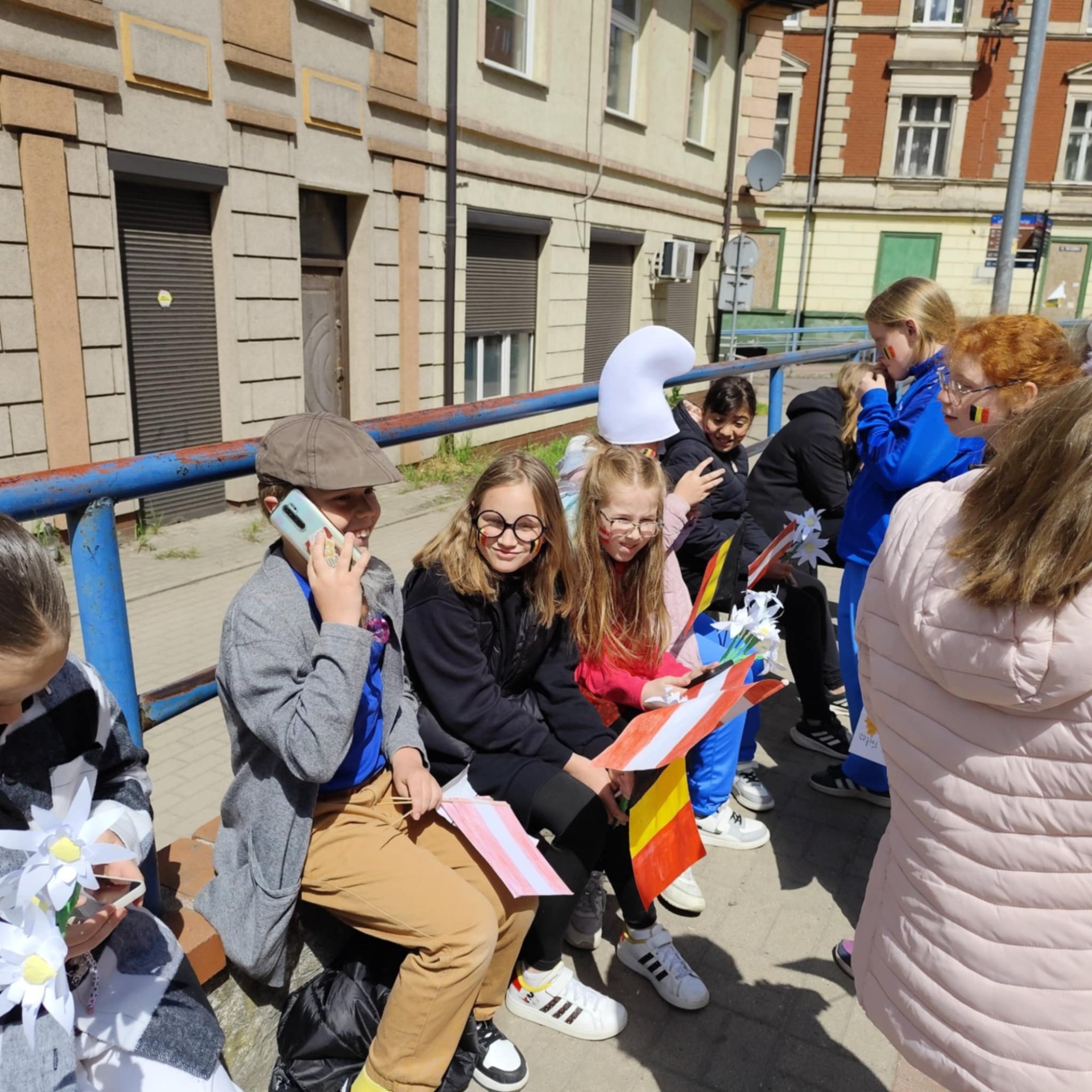 Klasa czwarta wraz z wychowawcą Elżbietą Bibrowską i panią dyrektor Renatą Gibes wzięła aktywny udział w obchodach Dnia Europy. Uczniowie przygotowali kolorowe plakaty z symbolami Austrii i Belgii, flagami krajów, przepiękne banery oraz pomysłowe stroje. Wszyscy uczniowie wzięli udział w uroczystym przemarszu ulicami miasta, niosąc swoje plakaty i flagi.