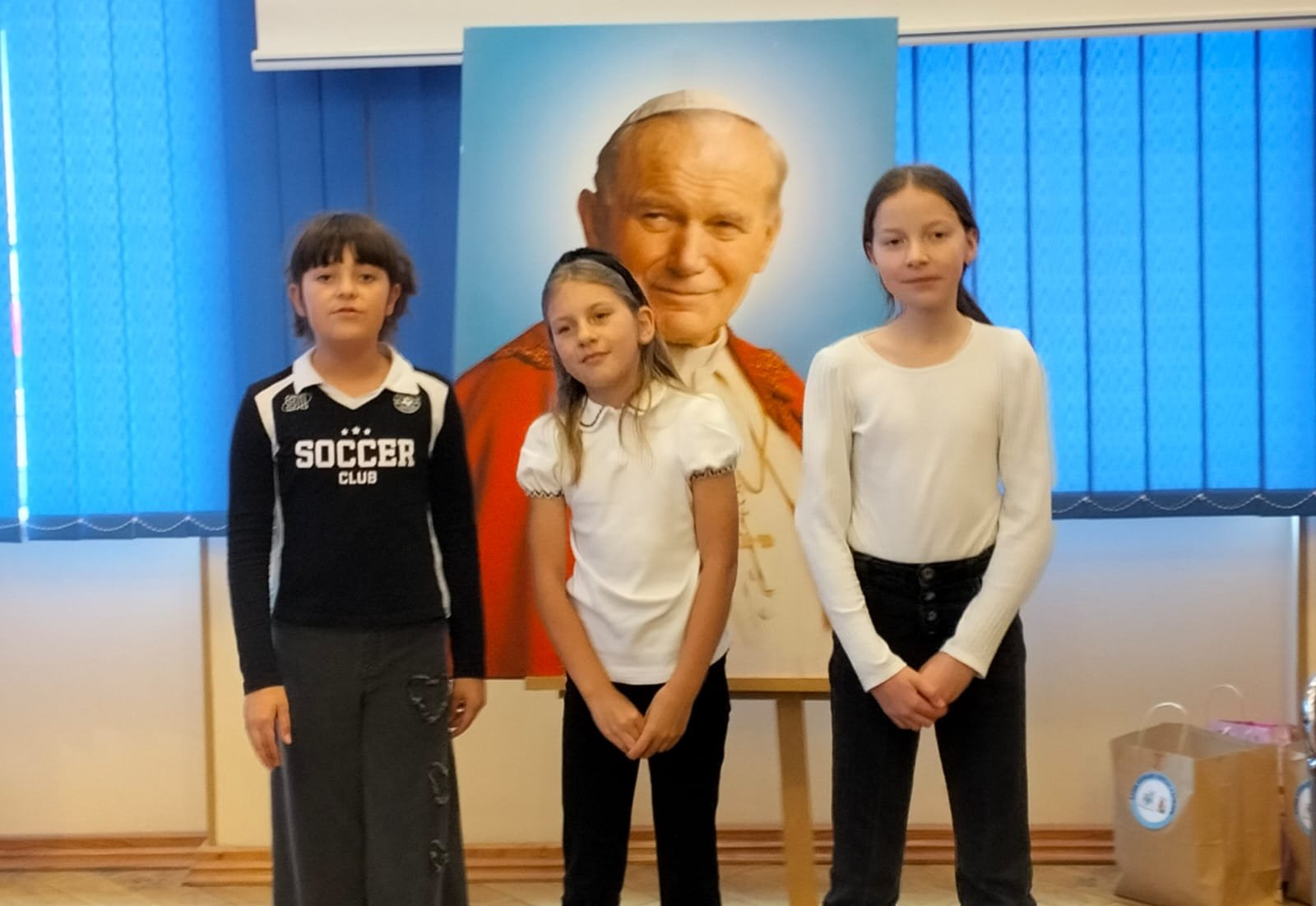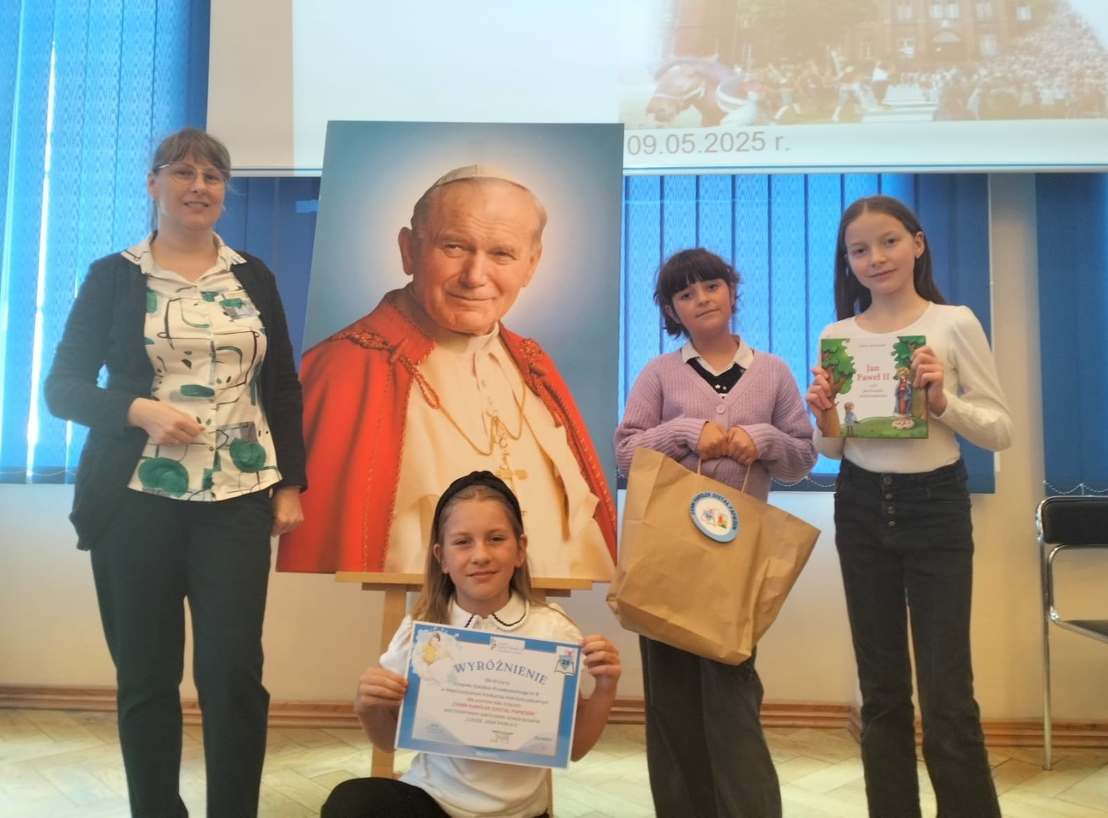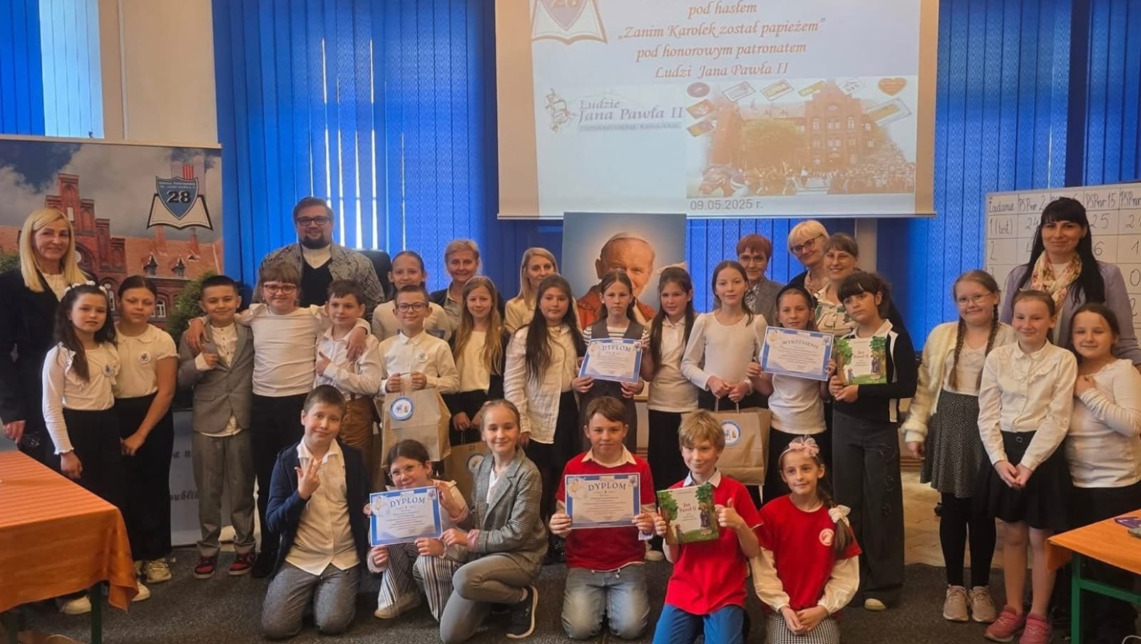 9 maja 2025r. w Szkole Podstawowej nr 28 odbył się Międzyszkolny Interdyscyplinarny Konkurs Papieski dla klas trzecich „Zanim Karolek został papieżem”, w którym naszą szkołę reprezentowały trzy uczennice z klasy 3c: Małgorzata Gaweł, Aleksandra Krassej i Zofia Sajdak. Podczas konkursu uczniowie musieli zmierzyć się z niełatwym testem ze znajomości życia młodego papieża, zaśpiewać piosenkę o papieżu, a także rozwiązać zadania matematyczne i ortograficzne. Konkurencja była bardzo duża a nasz zespół zajął 4 miejsce i otrzymał wyróżnienie w konkursie oraz nagrody pocieszenia. Na osłodę wszyscy uczestnicy zostali poczęstowani papieskimi kremówkami, a mile spędzony czas ubogaciły wspólnie śpiewane piosenki religijne.