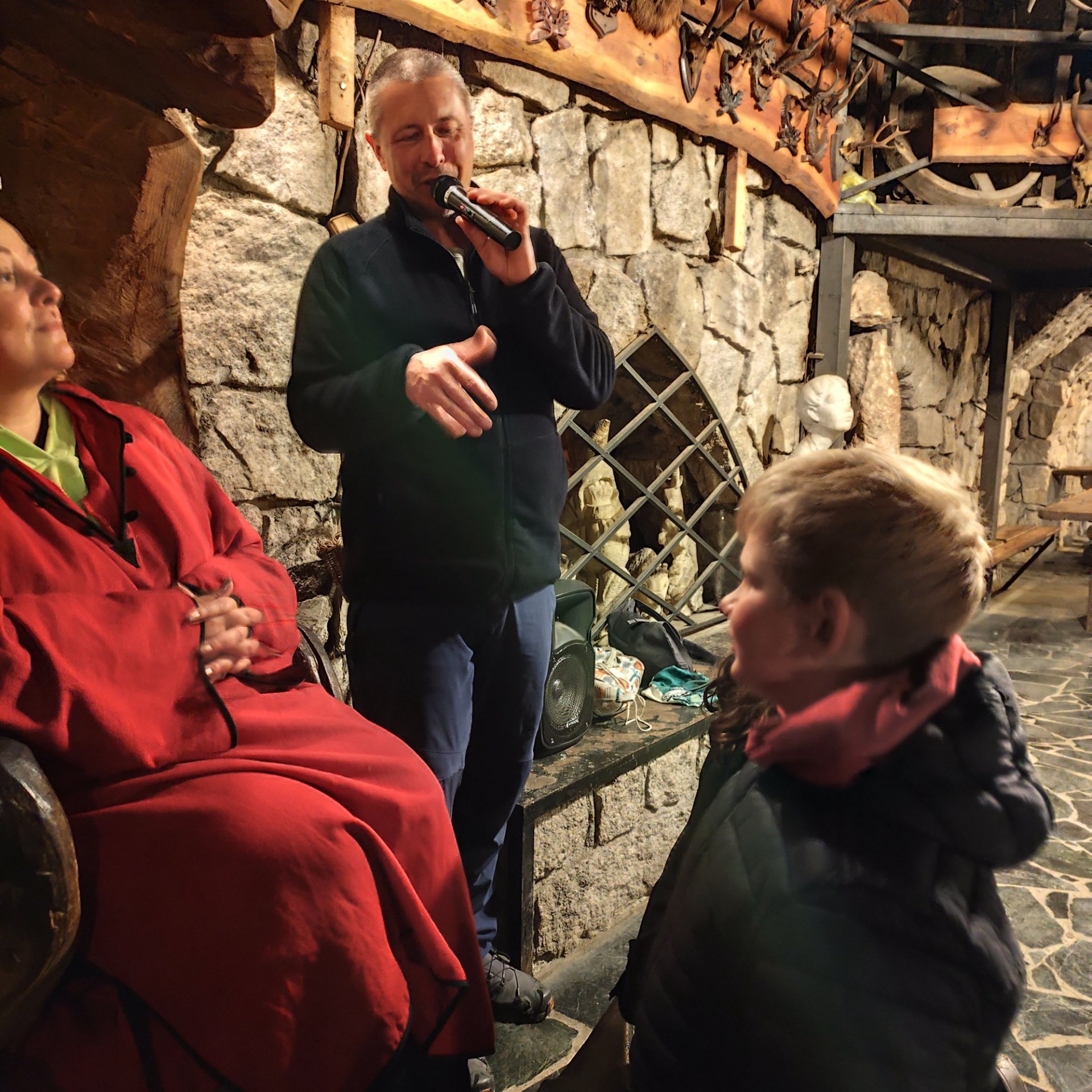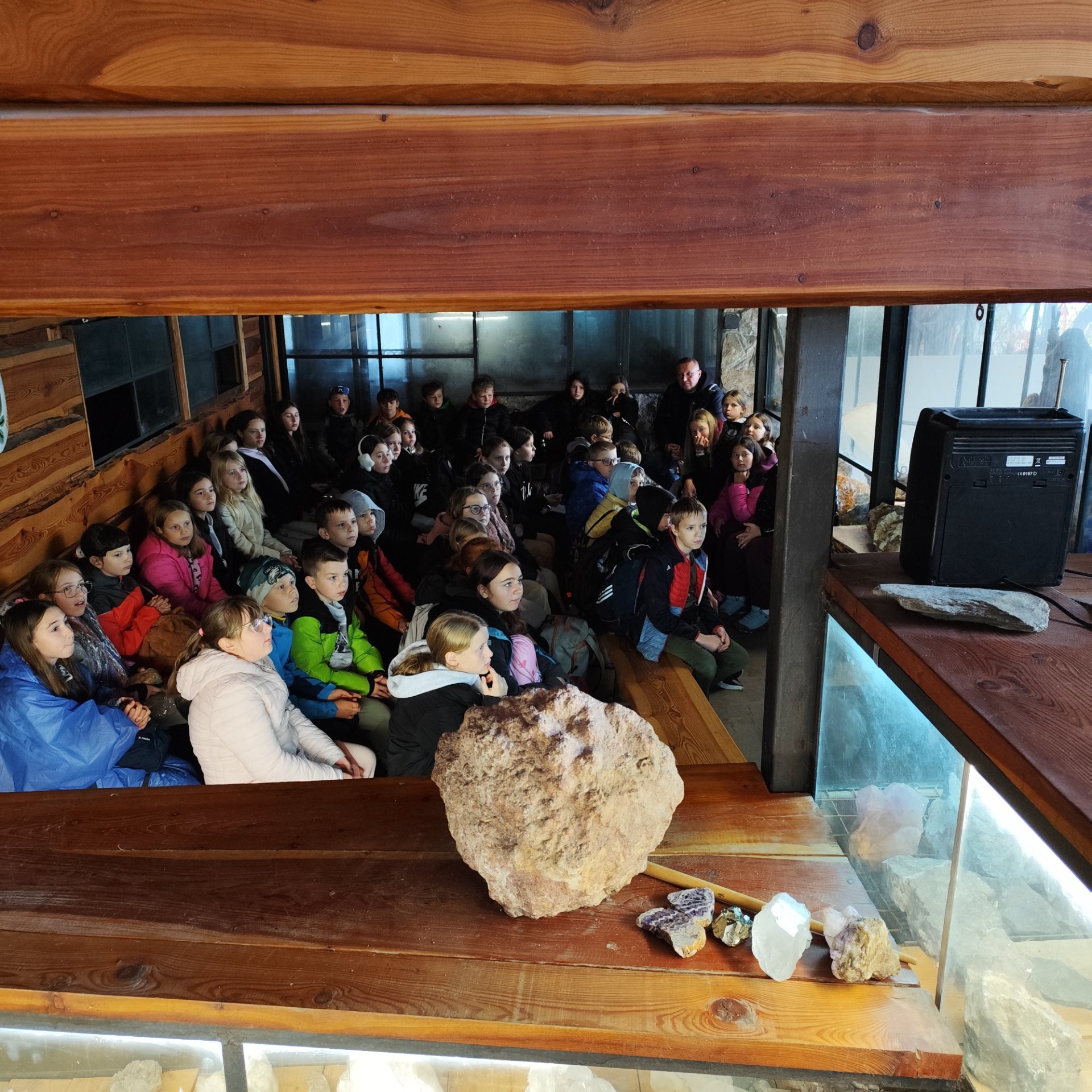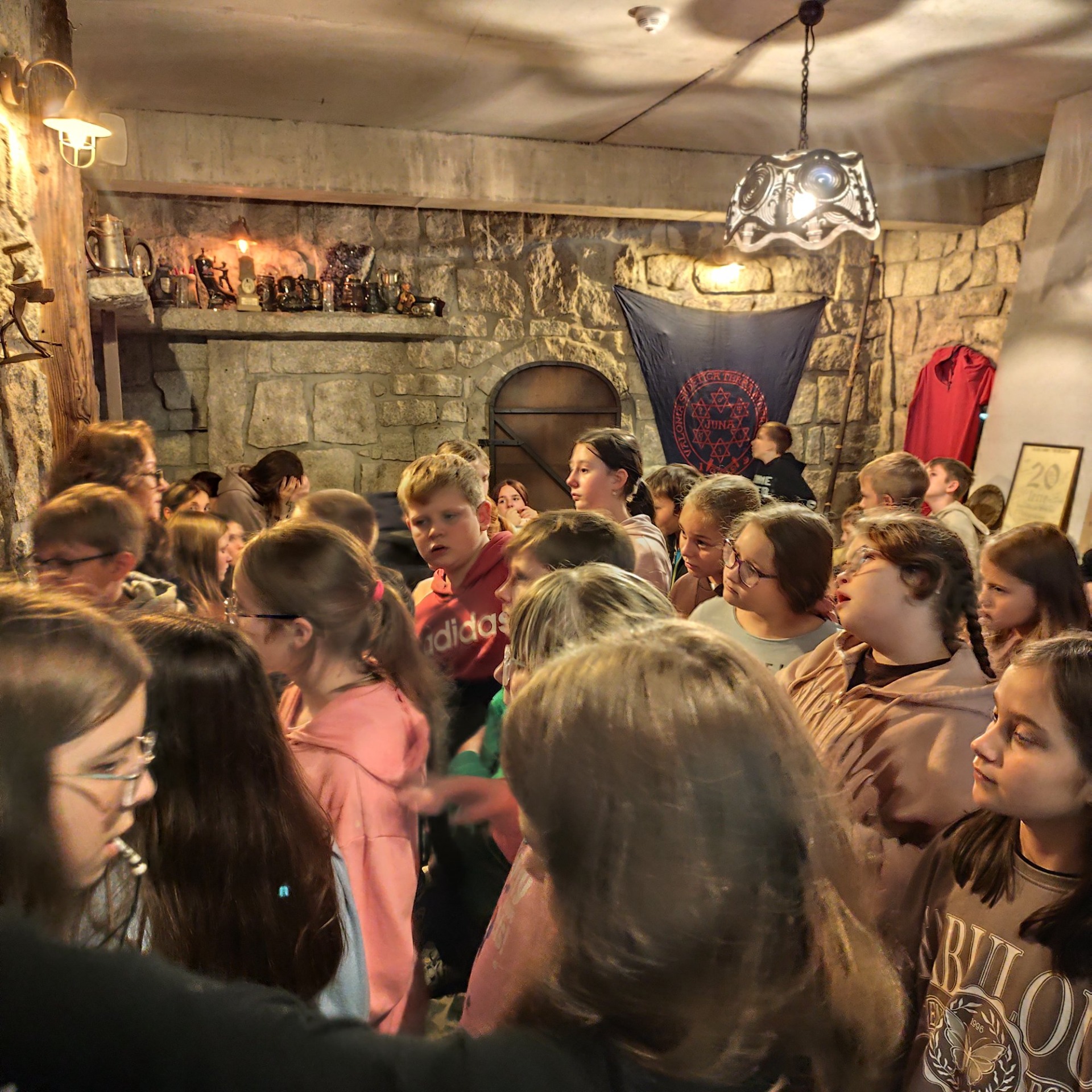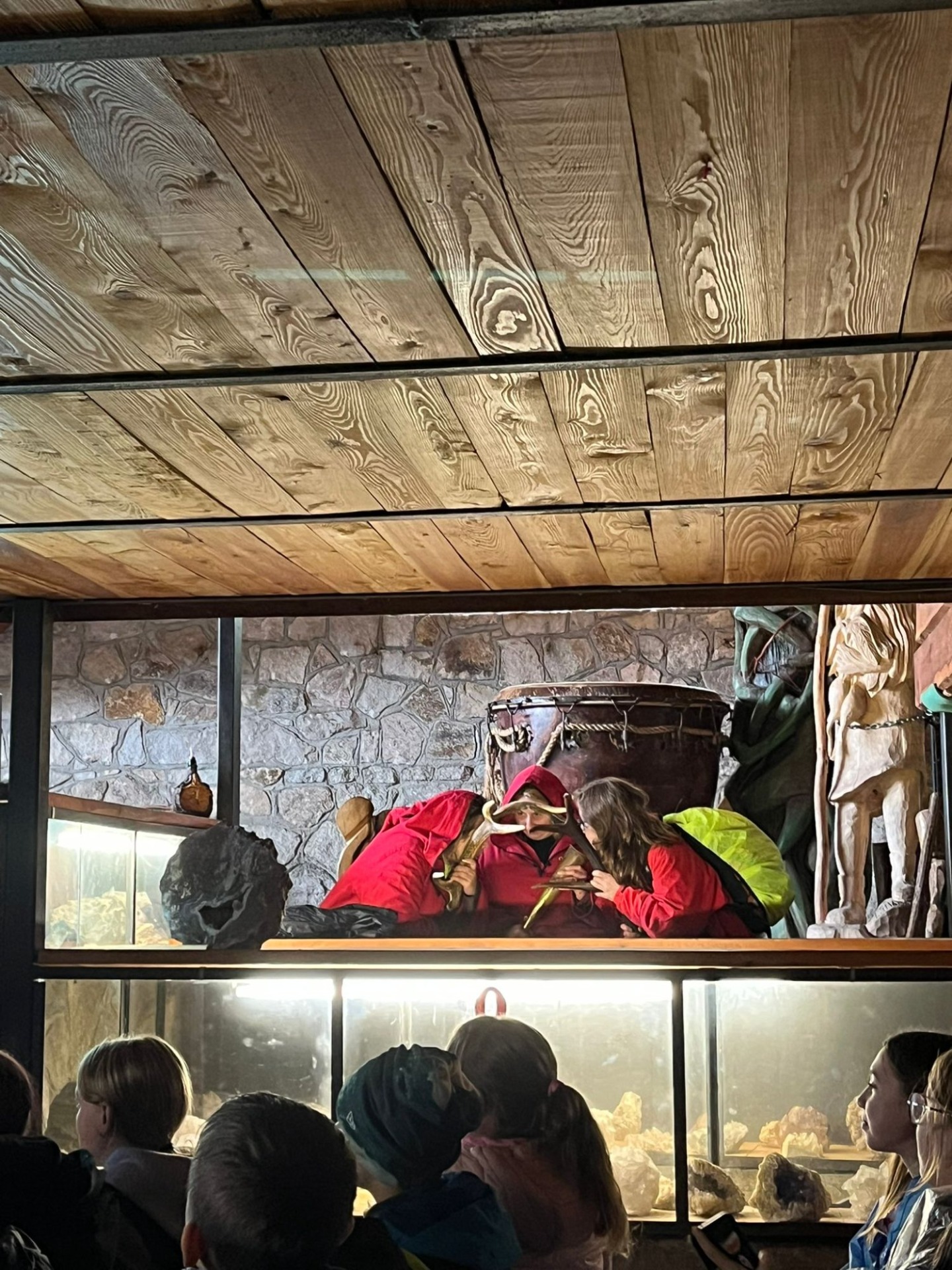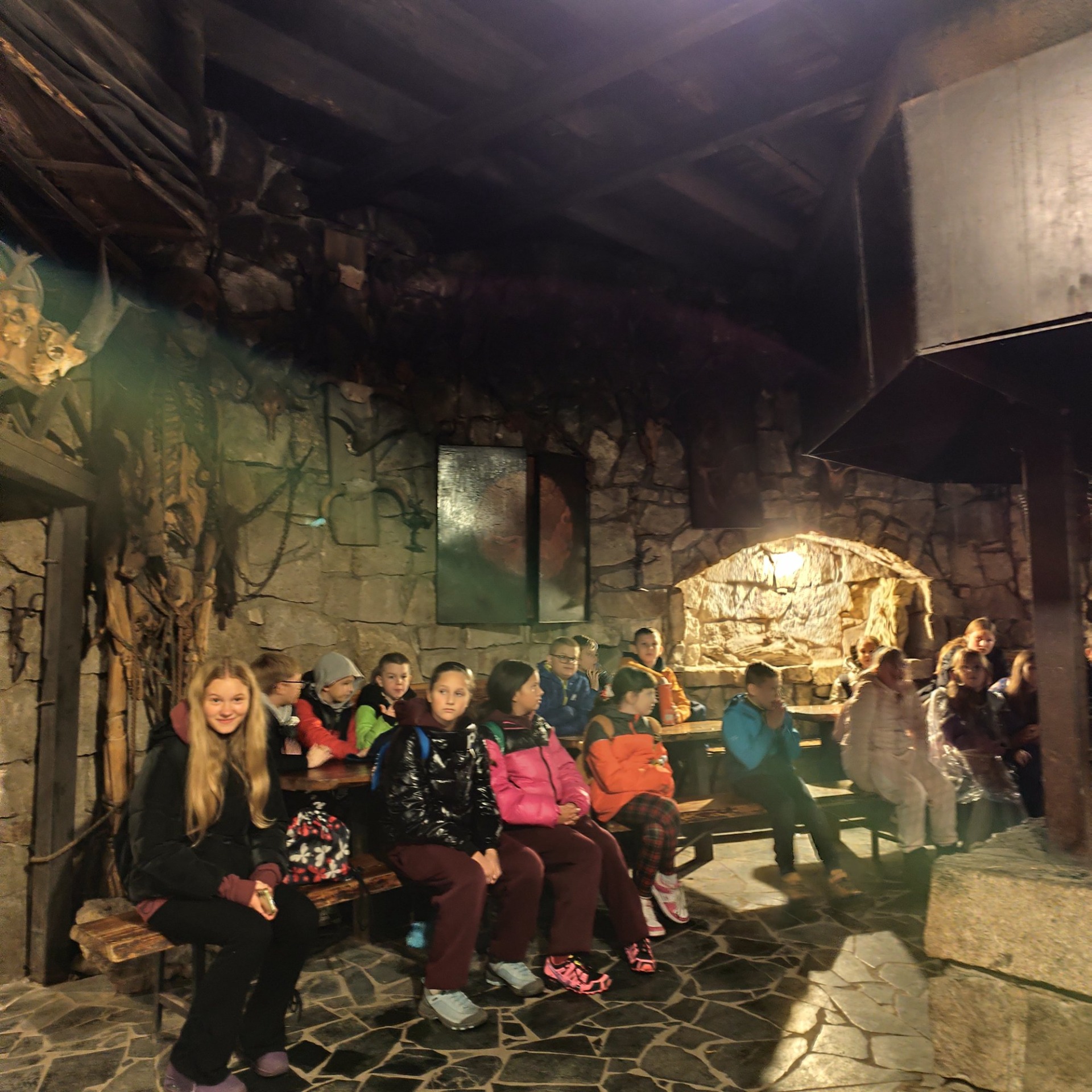 Jednym z najbardziej niezwykłych punktów naszej wycieczki były warsztaty w Chacie Walońskiej. Już samo wejście do tego miejsca przeniosło nas w zupełnie inny świat – pełen tajemnic, legend i niezwykłych opowieści o dawnych mieszkańcach Karkonoszy. Podczas zajęć poznaliśmy historię Walończyków – dawnych poszukiwaczy minerałów i kamieni szlachetnych, którzy przez wieki zamieszkiwali te tereny. Mogliśmy zobaczyć również naszych nauczycieli w zupełnie innej roli, Panie zamieniły się w mądre wiedźmy, a Pan Sadowski w mistrza ceremonii, którzy zakuli nas w dyby i przeprowadzili przez niezwykły ceremoniał.
