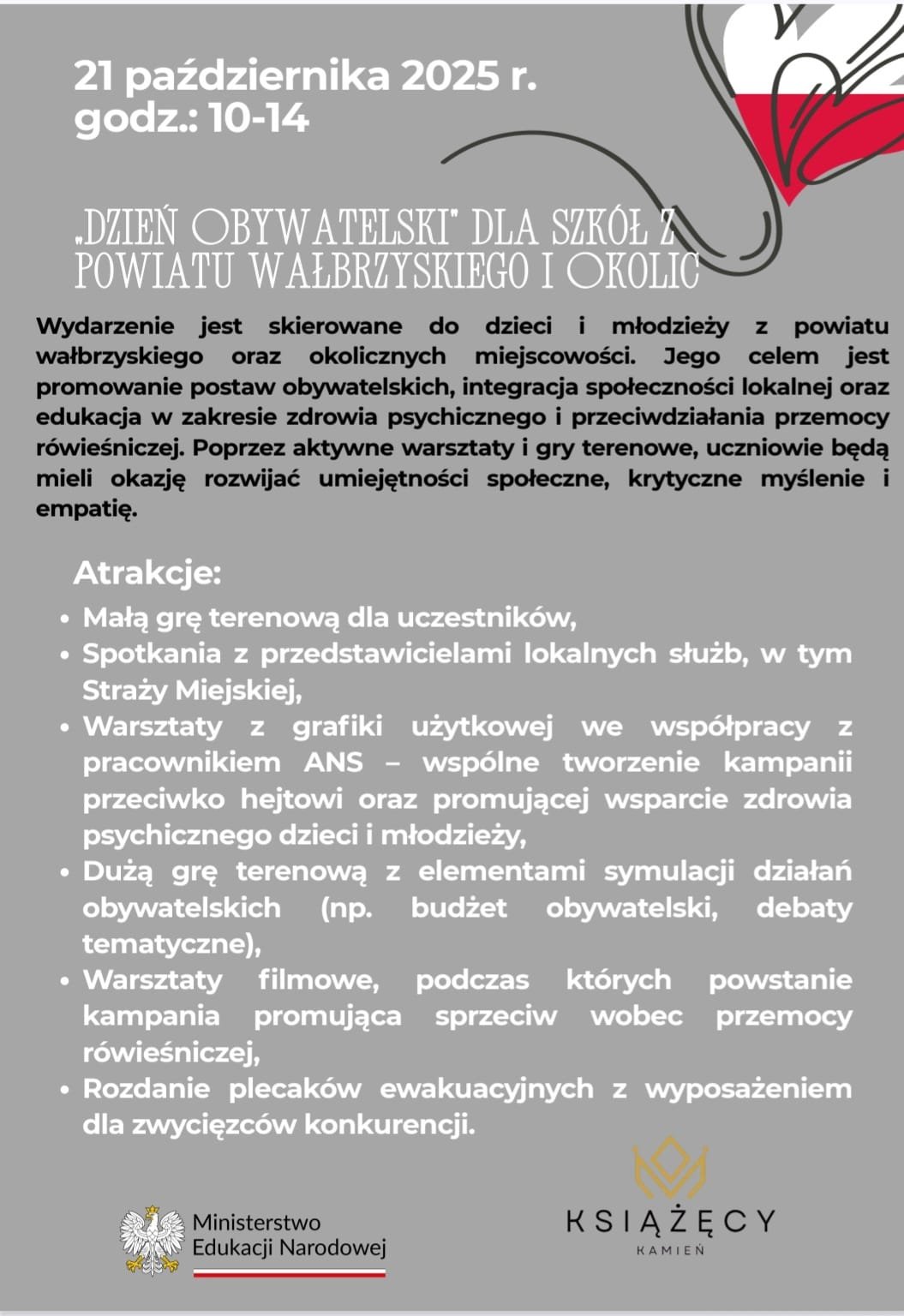Dzisiaj uczniowie naszej szkoły: Natalia, Maja, Vanessa, Dominika, Julia, Hania, Magda, Nadia, Laura, Natalia brały udział w "Dniu Obywatelskim", projekcie finansowanym przez Ministerstwo Edukacji Narodowej, realizowanym przez fundację Książęcy Kamień.