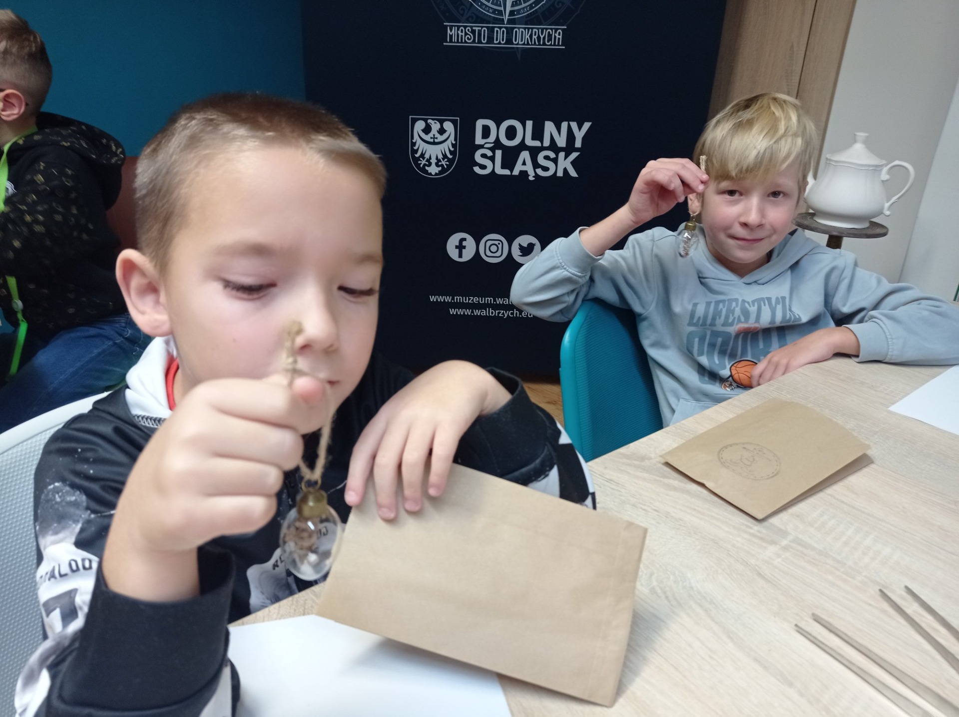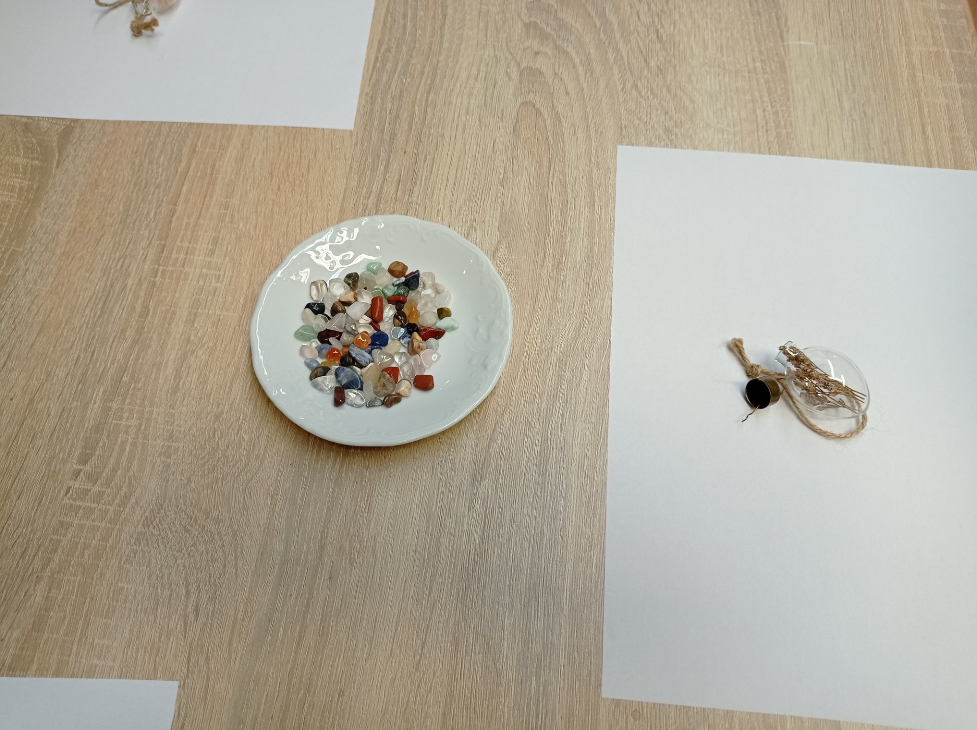 Ostatnia część zajęć to poznanie minerałów występujących na naszym terenie i tworzenie z nich talizmanów zamkniętych w małych szklanych bombeczkach. Talizmany zabraliśmy ze sobą. Fantastyczna przygoda, polecamy!!!