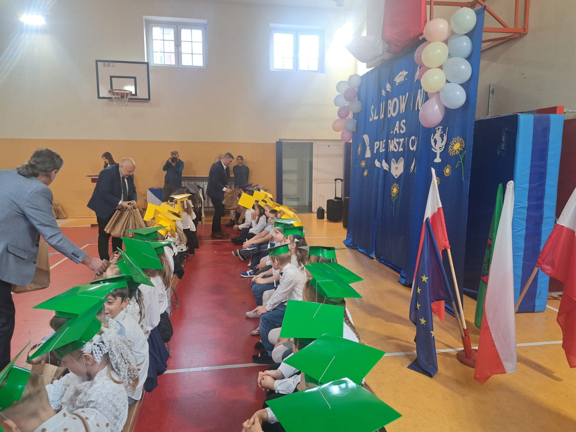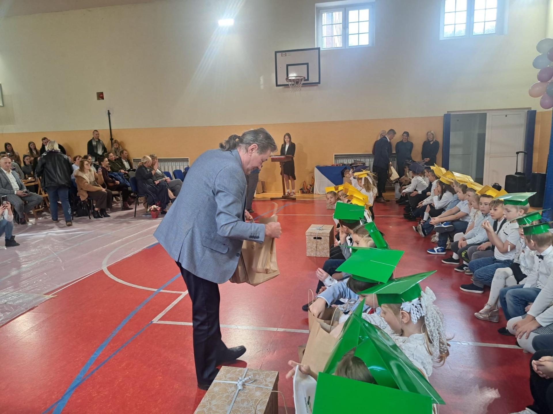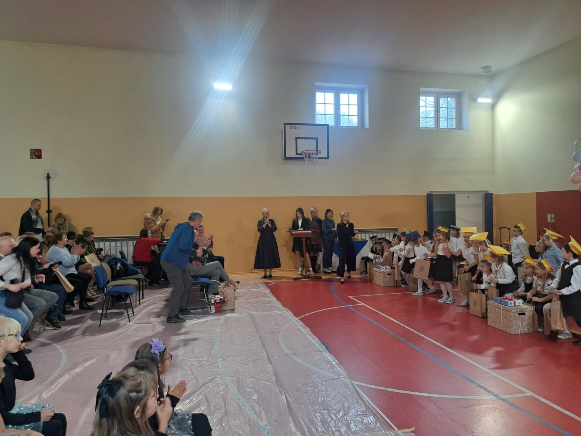 Goście, a także przedstawiciele Rady Rodziców oraz starsi koledzy z klas 2 i 3, wręczyli pierwszakom upominki, życząc im samych sukcesów na nowej szkolnej drodze.