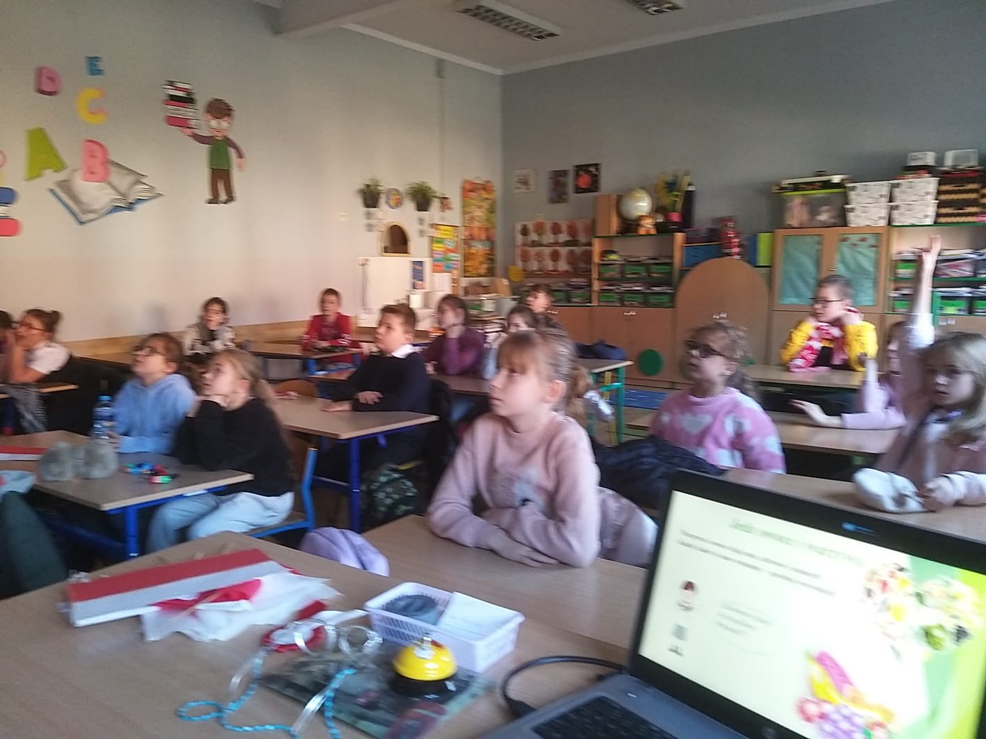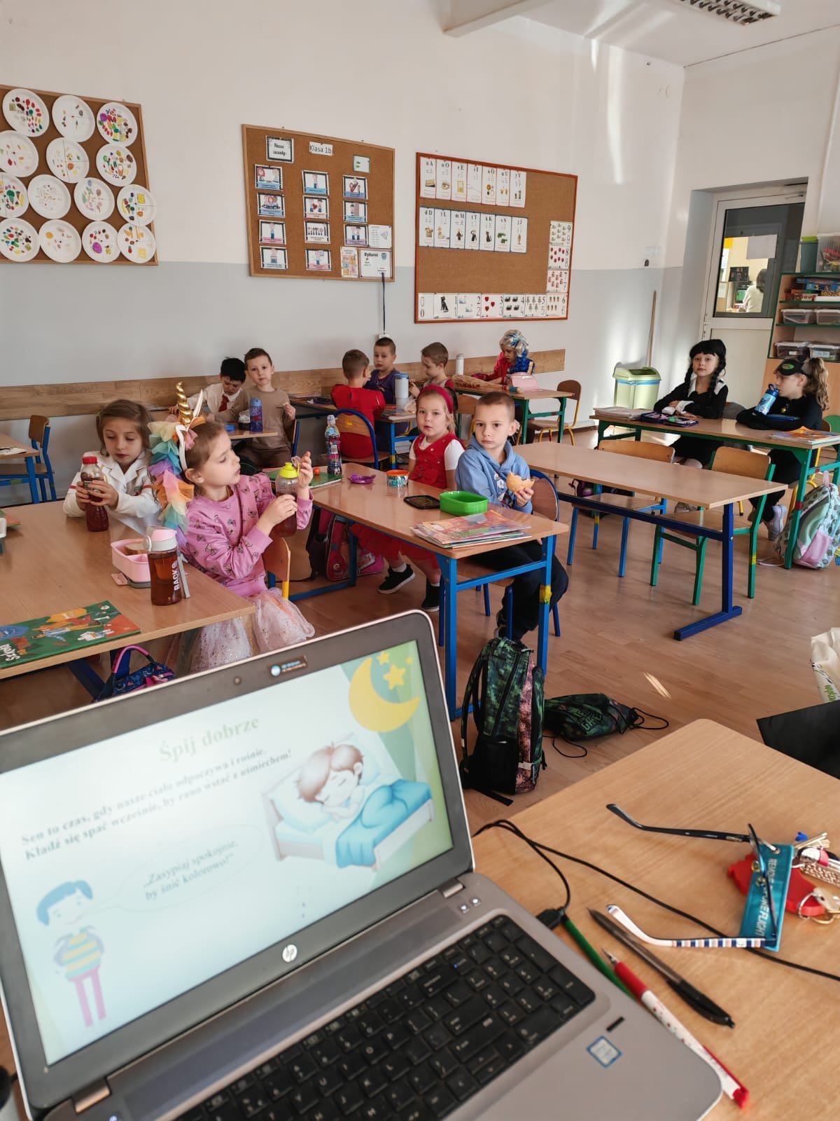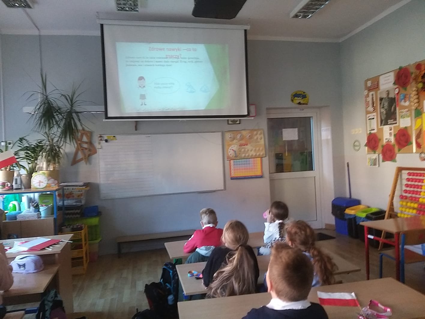 Uczniowie klas I–III uczestniczyli w bajkowej prezentacji multimedialnej „Zdrowe nawyki”, przygotowanej przez Arlettę Lenkiewicz.