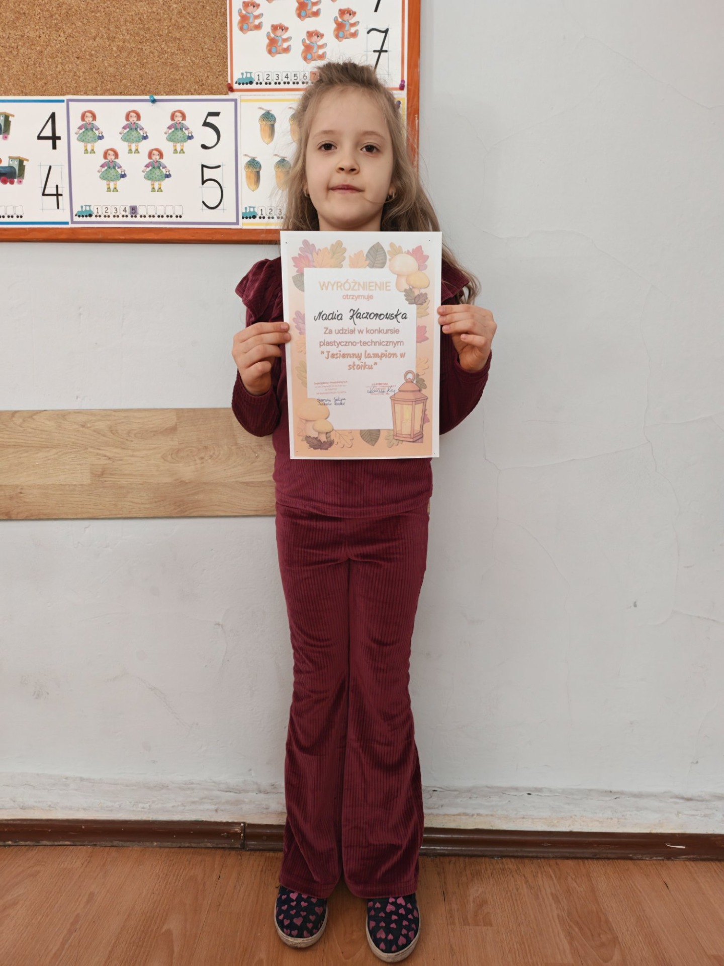 Z dum膮 og艂aszamy, 偶e uczennica z klasy 1b Nadia Kaczorowskazosta艂a uhonorowana wyró偶nieniem za udzia艂 w konkursie plastyczno-technicznym "Jesienny lampion w s艂oiku". To wspania艂e potwierdzenie jej plastycznych umiej臋tno艣ci. Gratulujemy sukcesu i 偶yczymy dalszych inspiracji!