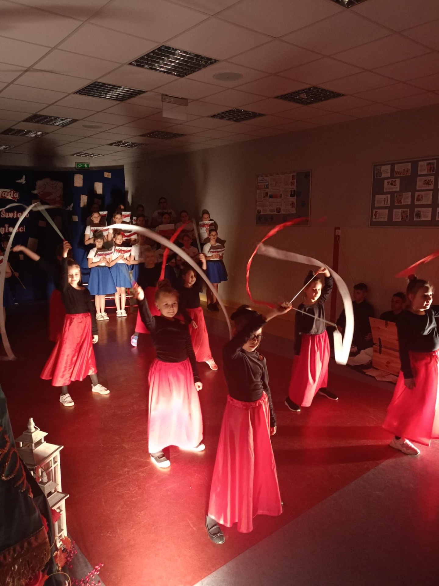 Dodatkowo uczniowie klasy 7c i 8a wyrecytowali fragmenty utworów poetyckich poświęconych tematyce wolności. Uwieńczeniem przedstawienia był pokaz artystyczno-akrobatyczny z szarfami w wykonaniu uczniów klasy 2c.